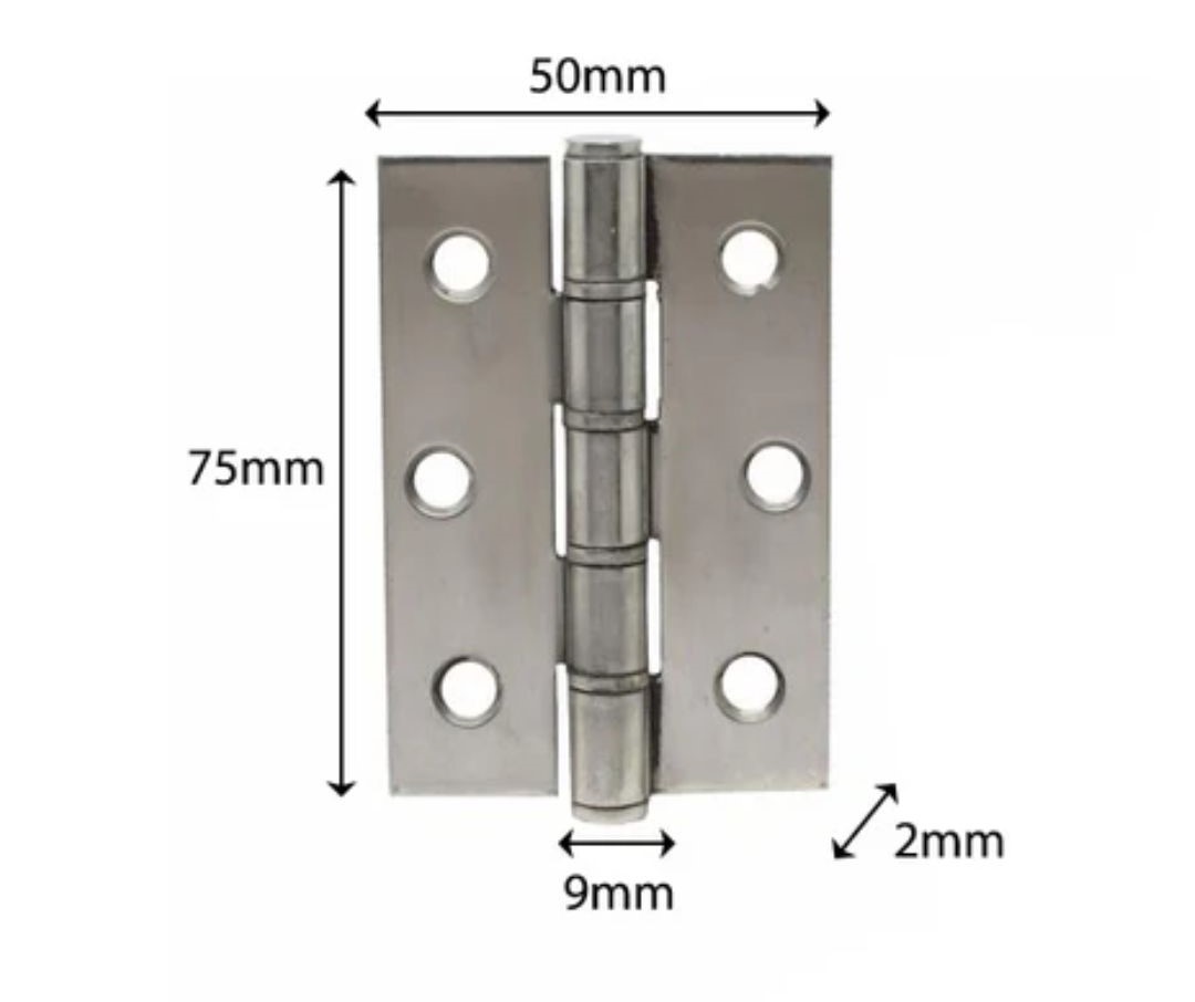 Washered Butt Hinge 75 x 50 x 2mm SKU: HW04293 Features Height:75mm Width: 50mm Thickness: 2mm Material: Stainless Steel (202 Grade) Finish: Polished Brand: Securit Use: Interior / Exterior Trade Enquiry Buy Now Specification Sheet